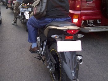 Motor berpelat putih tersebut tengah melaju kencang. Cukup penasaran dengan motor sport itu, detikOto langsung mengejar. Beruntung motor berlabur warna emas itu sempat tertahan di salah lampu merah.